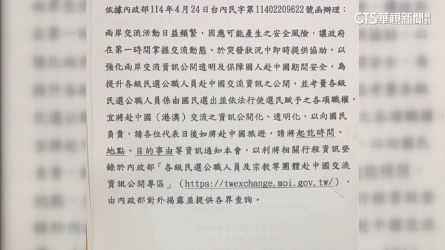 內政部4月就發出這份公文,為了強化兩岸交流資訊公開透明,以及保障國人赴中國期間的安全,並考量各級民選公職人員,都是由國民選出依法行使職權,宜將赴中國、港澳交流的資訊公開、透明化。日後如果要赴中國旅遊,就得通報時間地點和目的,以利將行程資訊登錄在內政部網站專區。