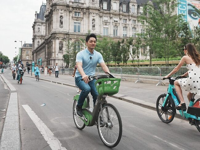 蔣萬安隨後前往巴黎市政廳前,體驗當地共享單車Vélib。他表示,車輛本身與台北的YouBike相似,皆具備可調式座椅與變速裝置,但最令他印象深刻的是,巴黎透過鋪設清晰可辨的自行車道,並以分隔島區隔雙向車道,有效提升騎乘安全與舒適性。此外,Vélib系統設計尖峰時段優惠,引導使用者將車輛停放至特定據點,協助車輛分流與調度,這樣的做法值得台北交通局進一步參考。