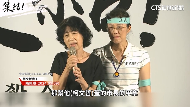 京華城案爆發,柯文哲彭振聲雙雙被羈押,民眾黨號召集結,點燃小草氣勢,柯文哲妻子陳佩琪(2024.09.09)說:「京華城的最後的決定是誰決定的,專案他(柯文哲)指派的專案經理人(彭振聲)同意的,那他(彭振聲)幫他(柯文哲)蓋的市長的甲章,結果現在變成我,我的先生被銬手銬。」