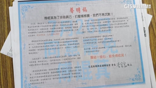 花蓮縣檳榔產銷聯誼會,昨(8)日在報紙上刊登半版聲明廣告,指控國民黨立委傅崐萁為了打擊特定政敵,讓許多檳榔農無辜受到波及,花蓮縣議會議長張峻更在臉書指出,傅崐萁為了斬斷他的經濟來源,動用檢調人脈及媒體等,不過藍營則提出反駁,認為張峻在混淆視聽,傅崐萁才是真正在為農民發聲。