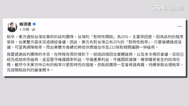 總統賴清德強調,這是暫時性關稅,而主要原因就是,因為談判的程序安排,台美雙方還未完成總結會議,因此,美方才會先對台灣公布20%的暫時性稅率,只要後續達成協議,後續可望再調降稅率,另外,台美雙方,後續也將就供應鏈合作,及232條款相關議題,一併磋商。