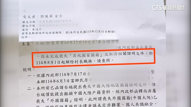 花蓮縣富里鄉學田村長前村長鄧萬華說:「你否定我,我也可以理解,我在選的時候,你就說我不能選嘛。」收到公文才知道,村長的職務已經沒了,前村長越說越情緒激動,她強調,嫁來台灣多年有身分證也有護照,選上村長都一年多了,現在政府要求她出示放棄中國國籍的佐證資料,根本沒辦法。