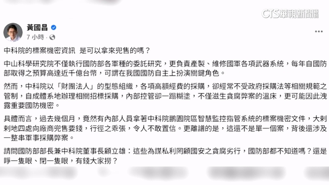 民眾黨立委黃國昌,點名內部人員拿著這份機密文件,大剌剌地四處向廠商兜售要錢。 中科院回應:「院內安全系統日前發現資料複印異常經初步調查,於8月14日移送憲指部報請檢察官主動偵辦。」