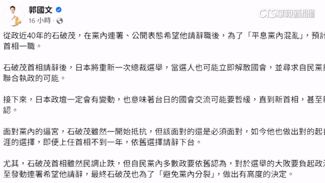 看看這一篇,民進黨立委郭國文臉書發文,石破茂雖然民調止跌,但自民黨內多數還是認為,選舉大敗他要負起政治責任,甚至發動連署希望他請辭,最終石破茂也為了「避免黨內分裂」,做出有高度的決定。