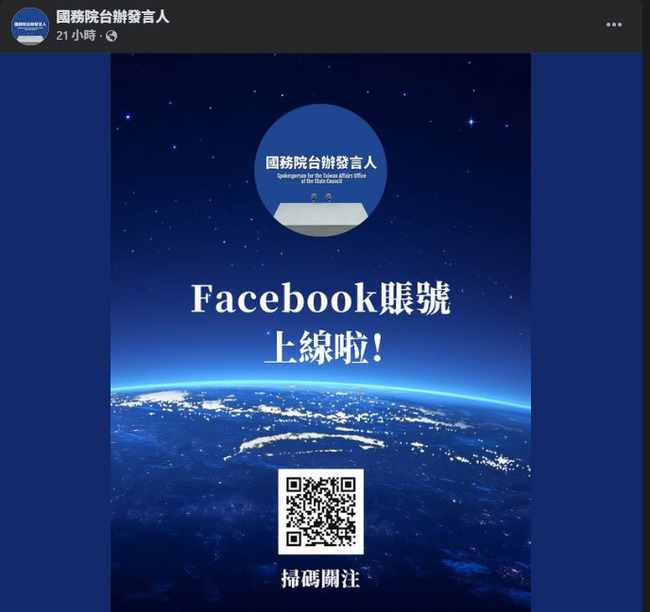 中國國台辦為加強對台新聞發布工作,於臉書平台開設「國務院台辦發言人」,昨(21)日首度發文。國台辦發言人朱鳳蓮今(22)日在例行記者會上表示,「該帳號將及時向兩岸同胞發布對台工作重要訊息。幫助兩岸同胞加強交流、凝聚共識。歡迎海內外網友關注,一起為推動兩岸關系發展、推進祖國統一加油鼓勁。」