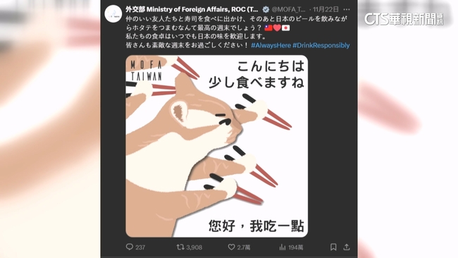 貓咪迷因,卡哇伊的貓咪迷因圖,配上中日雙語文字,這是我國外交部22日發布貼文,內容寫下,週末和最好的朋友一起去吃壽司,再喝點日本啤酒吃點扇貝,還有什麼比這更棒的呢,字裡行間展現挺日立場,起因就是因為這件事。