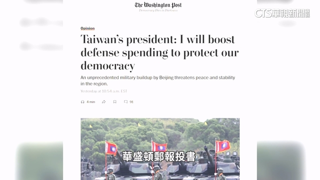 華盛頓郵報投書標題寫著台灣總統,主題是「我國將提升國防預算以捍衛我們的民主」,這篇投書,作者正是總統賴清德,美東時間25日投書刊出,內容提到我國近年國防預算已呈倍增之勢,將達到GDP的3.3%,承諾2030年前提升到5%。我國政府更將於近期提出一項史無前例的400億美元特別預算案,換算為台幣是1.25兆,強調我們對捍衛台灣民主的承諾。
