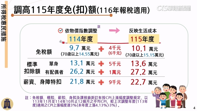 另外,綜所稅申報減稅也有利多,調高114年度每人基本生活費所需為21.3萬元,調高長照扣除額為18萬元;還有,70歲高齡駕駛自願繳回駕照者可領取回饋TPASS乘車金,最多每月1500元,可補助2年,等同最多可領3.6萬。另外政府加碼催生,生育補助每胎拉高至10萬元。