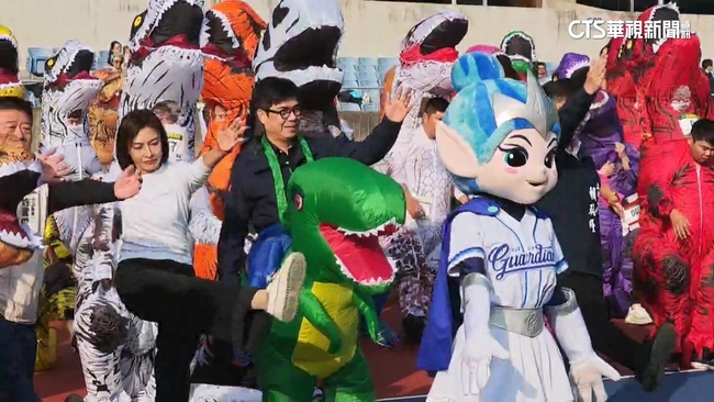 早上活動,高雄市長陳其邁今日一早穿上恐龍裝,出席馬拉松趣味賽,有意角逐接棒,高雄市長大位的,民進黨立委,賴瑞隆邱議瑩林岱樺,3人都在場黏緊緊有說有笑,跟著音樂跳舞動起來。
