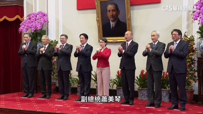 總統賴清德VS.立法院長韓國瑜說:「新年快樂(平安健康)」新春開工第一天,總統賴清德找來立法院長韓國瑜,以及行政司法考試監察,五院院長一起到總統府新春茶敘,大家有志一同黑色西裝,副總統蕭美琴,一襲紅色西裝外套,替茶敘增添不少喜氣,在福爾摩沙沒有什麼仇恨放不下,但非常可惜,我們去年的確錯過了許多機會,在新的一年開始我們把握這個契機,韓國瑜邊聽邊點頭。