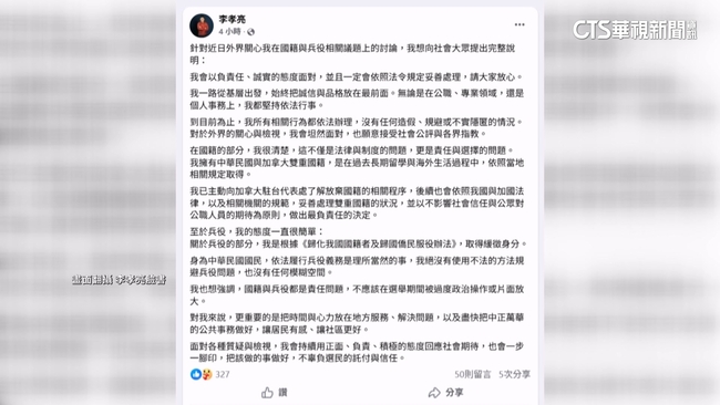 對此李孝亮發出臉書長文回應,表示已主動向了解放棄國籍相關程序,未來會妥善處理雙重國籍問題,至於兵役的部分,也強調是合法取得緩徵,也會依法履行兵役義務,而國民黨北市黨部也回應,資格審查小組會來檢視,參選人資格是否合格,隨著藍營北市議員初選登記起跑,已經聞到選舉戰火煙硝味。
