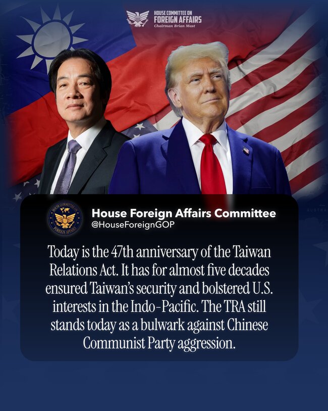 就在國民黨主席鄭麗文與中共中央總書記習近平「鄭習會」期間,美國眾議院外交委員會共和黨團在社群平台發文紀念台灣關係法47週年,強調該法長期以來不僅確保台灣安全,更是抵禦中共侵略的堅實堡壘。而引發各界注意的是,貼文的照片合成總統賴清德與美國總統川普,背景是我國與美國國旗。
