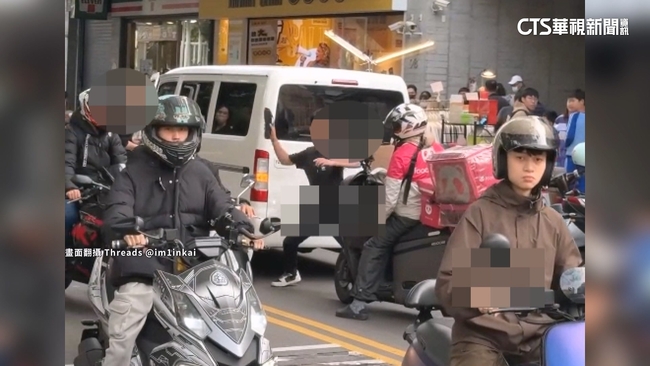 只是白色箱型車,貪圖方便違規臨停,造成後方車輛回堵,第一時間還一時情緒失控暴砸外送員,幸好當下外送員頭戴安全帽才沒有受傷。