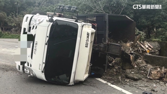 透過畫面可以看到,大貨車車身失控往左翻覆,撞擊護欄後停下,車上載運砂石、泥土掉落,瞬間揚起大量煙塵,對向駕駛差點被撞,趕緊剎車虛驚一場。汪姓司機手掌輕微擦傷,所幸沒有大礙,拖吊車也把大貨車吊走,並沒有影響車流。