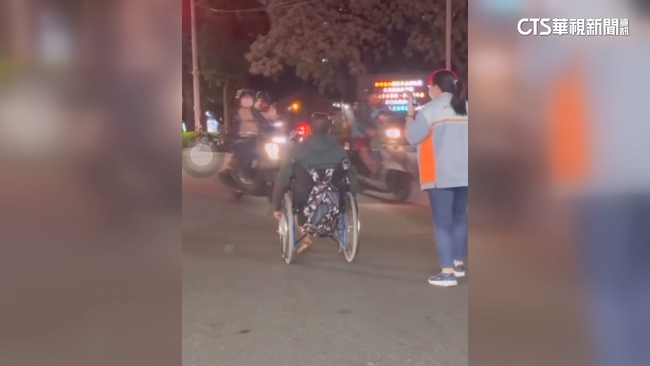 坐在輪椅上的男子在車陣中,用單腳滑行違規穿越馬路,旁邊站著一名超商女店長,一隻手幫男子指揮留意路況,另一隻手拿著手機錄影,全程被目擊民眾拍下,原來男子在幾分鐘前,跑到超商內想偷高粱酒喝,被女店長發現滑著輪椅就往外落跑,記者VS.超商店員說:「(很多次就對了),滿誇張。」