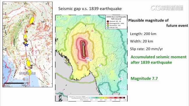 秀出多年前的研究簡報,預估緬甸實皆斷層在1839年強震後,未來可能再發生規模達到7.7的強震,328緬甸芮氏規模8.2的強震,發生在實皆斷層其中一個區段,在國內外專家眼裡看來都不意外,有台灣學者點出2018年時的研究,就發現實皆斷層上的地震空缺區,足以發生規模7.7的地震。