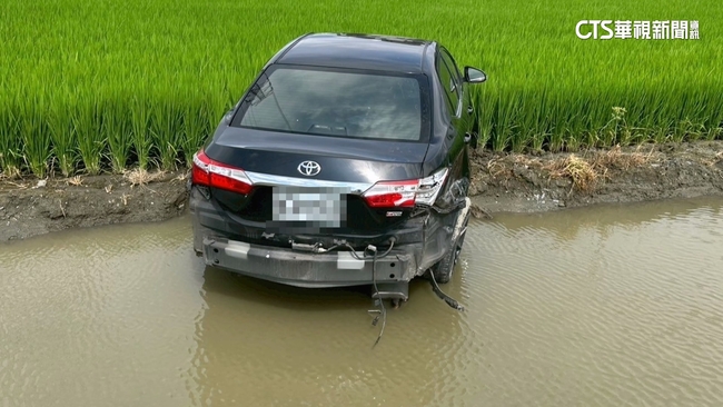 鄉間小路,白色休旅車一路往前開,與右邊黑色轎車發生碰撞,黑色轎車當場轉了90度,最後掉落田裡,激起超大水花。黑色轎車後輪深陷泥沼,動彈不得,側邊車身還有明顯,凹陷痕跡,白色轎車則停放路邊,等待員警到場。