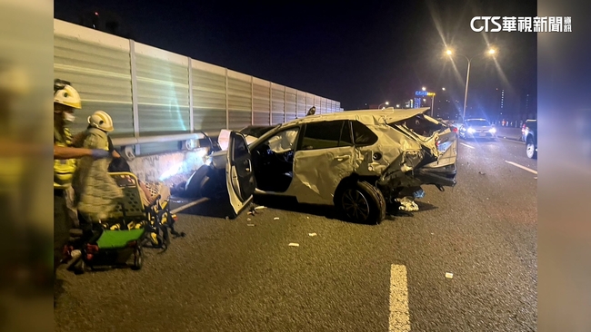 白色休旅車,垂直卡在台74線外車道,車頭車尾都明顯凹陷毀損,橫貼在外牆上的白色轎車,就是肇事車輛,2024年5月3日晚上10點多,白色轎車駕駛張姓男子,在速限80公里的快速道路上飆速,最快開到時速168公里,失控追撞前方轎車,又在內線撞上這輛白色休旅車,造成車內一對黃姓夫妻受傷。