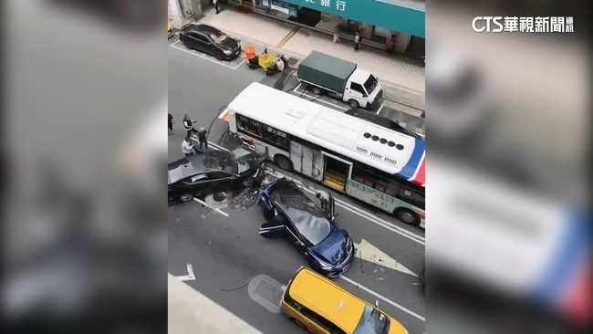 車禍現場一片狼藉,藍色轎車車頭凹陷,3台小客車和1台公車被波及,公車車尾還冒著白煙,肇事的黑色轎車車頭全撞爛,不少民眾圍在一旁,因為肇事駕駛仍受困其中,熱心救人民眾說:「我也進去幫忙他拉啊,但是就是那個轎車那個,那個要後來我看,我本來看到年紀,我以為大概60多歲,說他已經有78歲了吧。」