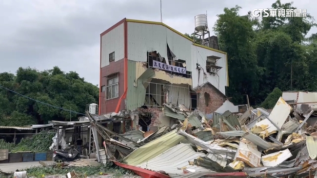 透天厝外牆被打穿好幾個洞,被拆下來的鐵皮,堆在屋子旁邊現場相當凌亂,外頭一片斷垣殘壁,牆面上高掛白布條,寫著「無良建商強拆民房」,門口的電表還在走,但是往屋子裡面看,滿地都是磚塊碎石頭,根本沒辦法住人。