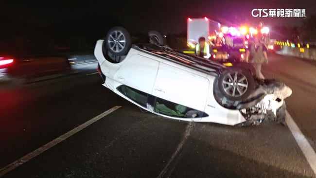 一輛白色自小客車疑似變換車道不當,擦撞到中線車道的賓士轎車,再導致賓士轎車擦撞到外側的聯結車,造成白色自小客車180度翻覆在路中央。整起車禍造成3人輕傷送醫,詳細車禍原因仍有待釐清。