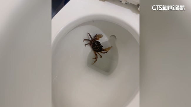 民宿業者說:「你看看,我覺得這個馬桶裡可能有什麼好料的東西。」深棕色的螃蟹,就這樣靜靜地趴在馬桶裡,而業者也見怪不怪,在旁邊揣測牠的想法下註解,全是因為牠是老朋友了。