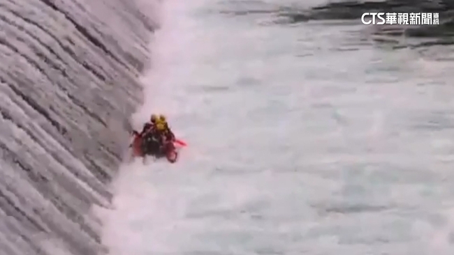 警消人員搭乘船艇,準備執行搜救任務,但強勁水流不斷沖擊,重心不穩下整艘船翻覆,兩人落水後急忙爬上船艇,但還有三人溺水待救。