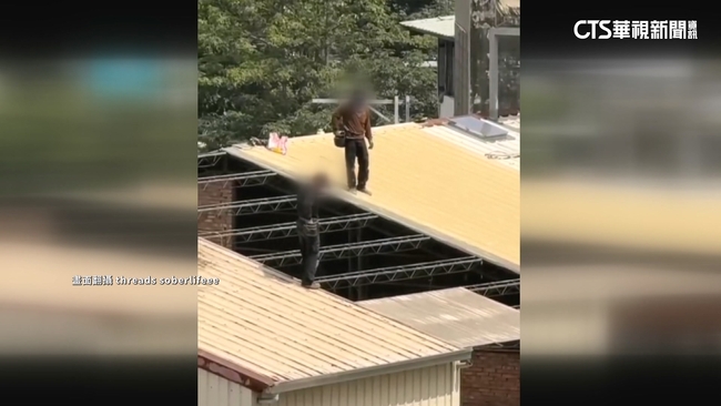 兩名工人在進行拆除樓房的工程,站在鐵皮屋頂上施工,兩個人都沒戴安全帽,也沒看到有繫安全繩索,就在4、5層樓高的地方走來走去,其中一名工人,彎腰抓起屋頂鐵皮,走到屋簷的地方,將鐵皮往樓下丟,丟完一片再丟一片,其中一片還打到靠著房子的樹。