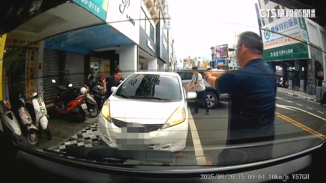 員警說:「下車下車,趴在地上。」大批警力右手拿著槍,對著停在路邊的白色轎車大聲喊話,有的員警把身穿深色襯衫的男子壓制在地上,還有人把對方壓在車邊,現場氣氛劍拔弩張很緊張,員警說:「來你們涉嫌那個,恐嚇取財。」