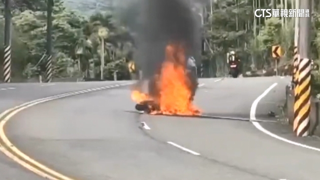 在苗栗台3線獅潭路段,一輛大型重機行經彎道時疑似失控自摔,當場起火燃燒,瞬間竄起的熊熊烈焰將車輛吞噬,濃煙直竄天際,畫面相當驚悚。幸好25歲楊姓男子及時脫困,只有擦傷送醫。
