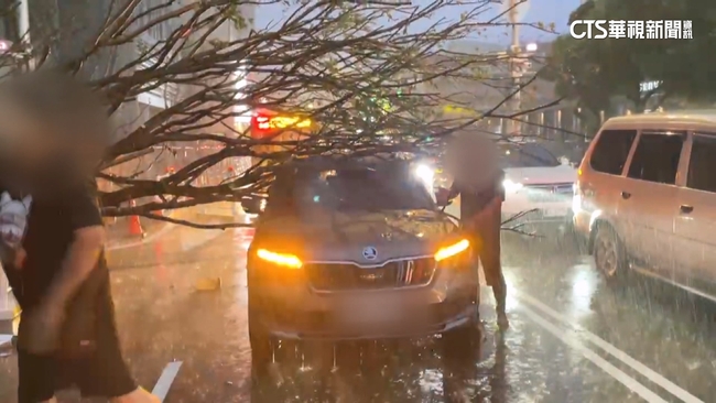 2位民眾為了救人連雨衣都沒穿,能鋸多少算多少,意外事故發生在昨(7)日傍晚5點多,台中下起大雷雨,西屯區青海路與文心路口,路樹突然倒塌還砸中這輛休旅車,記者VS.休旅車女駕駛的丈夫說:「(車裡面現在還有誰),我妻子跟我岳母,沒怎麼樣。」