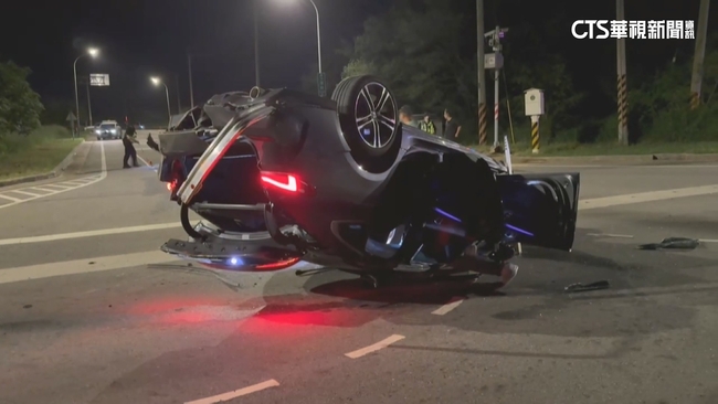 監視器畫面看到,黑轎車一路撞,來到一處路口時,整輛車翻覆四輪朝天,不久看到黑衣短褲的駕駛,從車子裡爬了出來,第一時間不是關心,被他撞上的人跟車,而是不斷查看自己的車子,還看得很仔細,接著有名熱心民眾,看到撞成這樣,衝上前去關心男駕駛狀況。