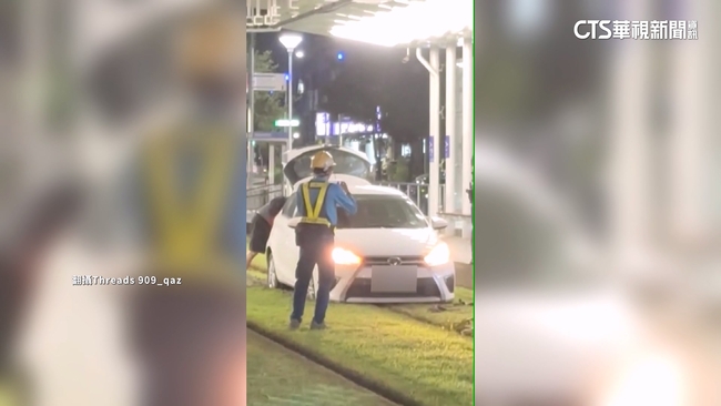 白轎車卡在軌道上,整輛車動彈不得,被請來的吊車,還有現場工作人員,趴在車頭前,想辦法要讓車子脫困,不久獲報的警方趕到,警方說:「往左墊,都要墊高。」3、4名員警合力挪移轎車,把車子推出軌道,才讓轎車終於可以開離現場,警方說:「先不要彎,開出來,開出來,開出來。」