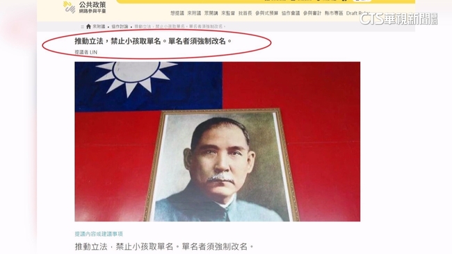 一名民眾提議,主張應立法「推動立法,禁止小孩取單名,單名者須強制改名」,並要求已使用單名者強制更名,引發強烈反彈。此論述遭到多數網友抨擊,有人直言該提案「毫無科學依據」。