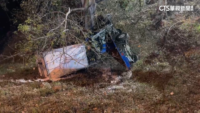 國道旁的樹叢冒出熊熊火焰,伴隨大量濃煙,救難人員說:「看到車子起火。」起火的是一輛冷凍貨車,整台側翻卡在樹叢邊,車頭變形被燒得焦黑,車上的冷藏櫃和車身分離。