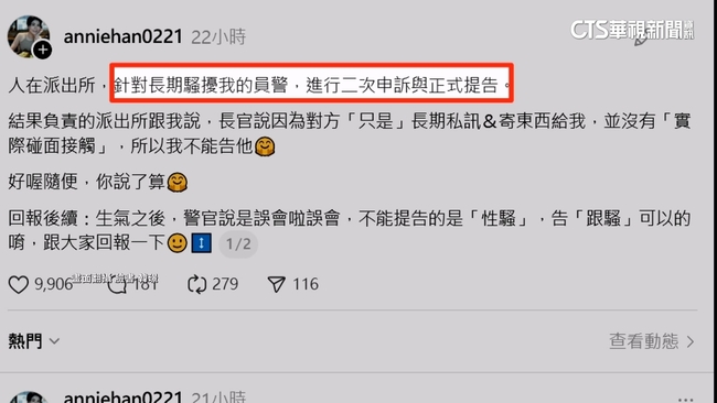 韓璟發文指控,這名員警不斷透過陌生帳號,傳送令她不適的訊息,韓璟沒有回覆直接封鎖,沒想到對方竟換帳號繼續騷擾,發現員警在台中任職,向警方申訴去年12月,對方還附名片送禮物到朋友公司,幫忙轉交韓璟受不了,再申訴提告跟騷聲請保護令。