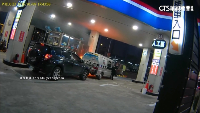 目擊民眾說:「著火了啦,啊,那邊,他著火了。」加油站內,民眾驚慌失措,只見加油島邊燃起熊熊火光,火勢還延燒到一旁的運鈔車,加油站員工急忙拿起滅火器滅火,整個加油站煙霧瀰漫,一名男子全身衣物被燒到焦黑,還不斷往前走,加油站員工被嚇到不斷後退,拿著滅火器與男子對峙。