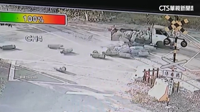 事發就在今(10)日早上八點多,嘉義竹崎鄉,影片中這輛載運瓦斯的貨車疑似,沒將瓦斯桶捆綁好,就上路,結果行經平交道附近時,路段有坡度,才會導致轉彎過程,不慎掉落。