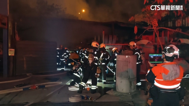民眾深夜發現,路邊一間鐵皮屋,不斷竄出熊熊烈火,裡頭還停放不少車輛,情況看起來相當危急,消防人員獲報後,立刻趕往現場,發現鐵皮屋仍在冒出濃煙,搶時間布起水線灌救。