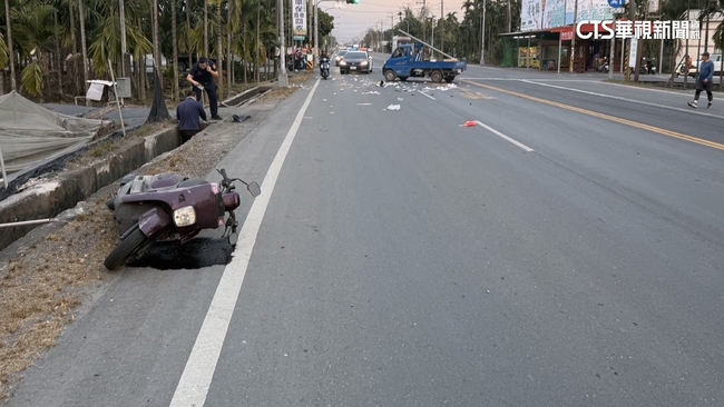 機車直行在馬路上,突然後方一輛黑色轎車撞了上來,機車騎士被撞飛當場倒地不起,車上的物品散落一地,但車子沒有停下,反而直接落跑。目擊民眾說:「見到摩托車跟人已經躺在地上不動,撞擊的車輛沒有看到。」