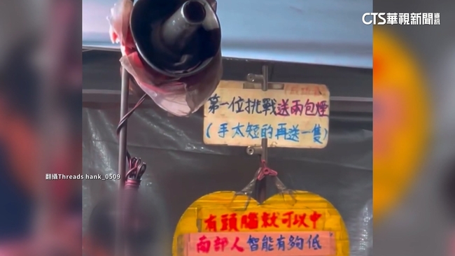 屏東潮州春節市集,每天都人潮滿滿,不過有個攤位掀起爭議,攤位的看板寫著,第一位挑戰者送兩包菸,這獎品已經不太合理了,結果底下的看板更是誇張,寫著「有頭腦就可以中」,