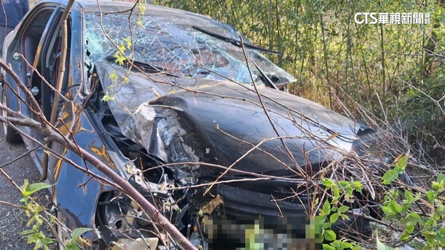 黑色轎車卡在樹叢內,車頭前方嚴重毀損變形,駕駛座內還有一名女子,受困在車內。消防人員說:「右腳有一個開放性骨折,左腳卡進去,還沒辦法確認傷勢。」消防獲報到場,拿出破壞器材,拆卸副駕駛座車門,嘗試從轎車右側將女子拉抬脫困,費了好大一番功夫,終於成功將人救出來,趕緊移上擔架送醫。