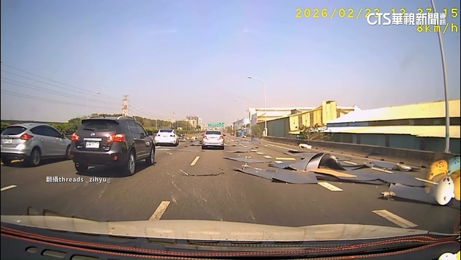 民眾行駛在國道上,右前方一輛小貨車,車身突然向左傾斜,下一秒車斗上載運的大型鐵片,全都掉了出來,鐵片瞬間飛砸往旁邊轎車,後方車輛看到緊急剎車,但還是有駕駛閃避不及輾過鐵片,驚悚一幕發生在昨(23)日,國1楠梓路段,鐵片占用好幾個車道,一度影響交通。