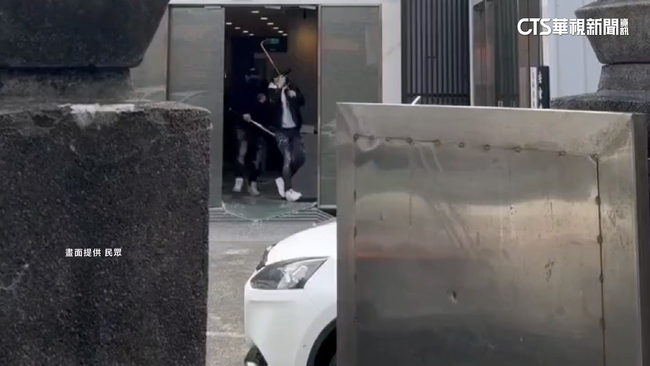 一連三台汽車排排站,停靠路邊車門一打開,整群遮臉的黑衣人,手持棍棒從三台車氣勢洶洶下車,他們隨即衝進一旁的殯葬會館,就是一陣亂砸。