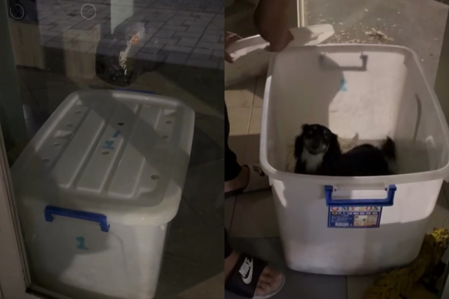 昨(23)日晚間有民眾經過一家連鎖寵物店時發現,店家打烊後竟然將販售的臘腸犬關在塑膠收納箱內,只在蓋上開了幾個小孔,透過蓋子上的孔可以看到,小狗在一直用身體衝撞收納箱,並且不斷吠叫,顯得相當不安。