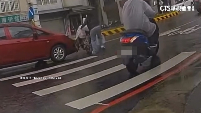 綠燈亮起,機車騎士們預備備向前衝,但忽有龐然大物擋住去路,蓋一紅色休旅車也,同一時間斑馬線上,一名女子正推著坐輪椅的民眾過馬路,沒想到休旅車駕駛竟沒禮讓,反而偷偷往前移動,女子發現連忙把輪椅往旁邊一挪,但已經來不及了。