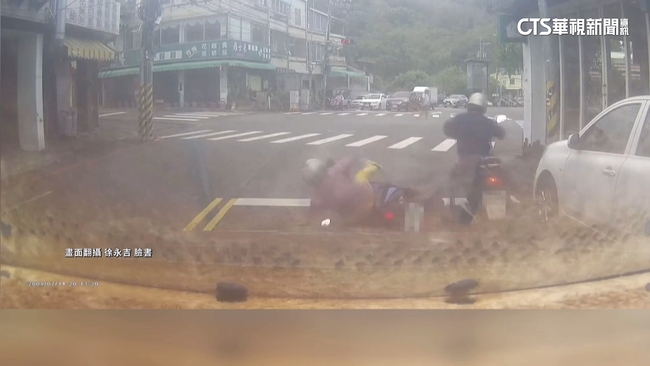 後方目擊民眾說:「啊,唉唷,是怎麼啦。」後方車輛的駕駛和乘客,目擊經過,驚叫連連,過程都被行車紀錄器拍下,駕駛趕緊追上去,才發現婦人轉彎後,連人帶機車倒在民宅門前,原來她的機車剎車故障,情急之下用腳當剎車。