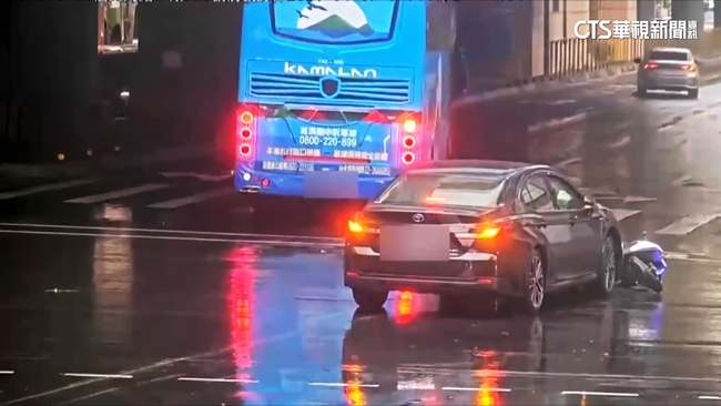 雨下不停,大批身穿雨衣的騎士,都在路口停等紅燈,但下一秒,肇事轎車,保險桿都被撞出一個大洞,好幾輛被撞的機車,車尾嚴重毀損甚至有機車上頭,還卡著車輛的碎片。目擊民眾黃姓醫檢師說:「超可怕,因為就離我滿近的,就是撞倒了一堆機車這樣子,然後那一台車撞了之後,好像也沒有停,然後就到對面了這樣,就是我停好自己的車,然後去看現場有沒有需要幫助的。」