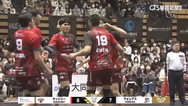 「黑狗」陳建禎,在隊友虛攻掩護之下,斜線殺球以8比8追平分數。只可惜對手也在這時踩油門加速得分,最終是SUNTORY SUNBIRDS OSAKA,以25比20、25比19、25比16直落三贏球。