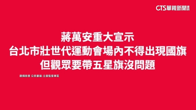 臉書粉專大大寫下,蔣萬安重大宣示,台北市壯世代運動會場內不得出現國旗,但觀眾要帶五星旗沒問題,執委會緊急出面澄清,雙北世壯運發言人郭音蘭說:「本屆賽會依據國際壯年運動總會,IMGA,相關的規範,訂有賽會儀軌,僅在比賽與頒獎等正式儀式場域中不攜帶旗幟,觀眾席則無限制,歡迎大家進場為選手加油喝采。」